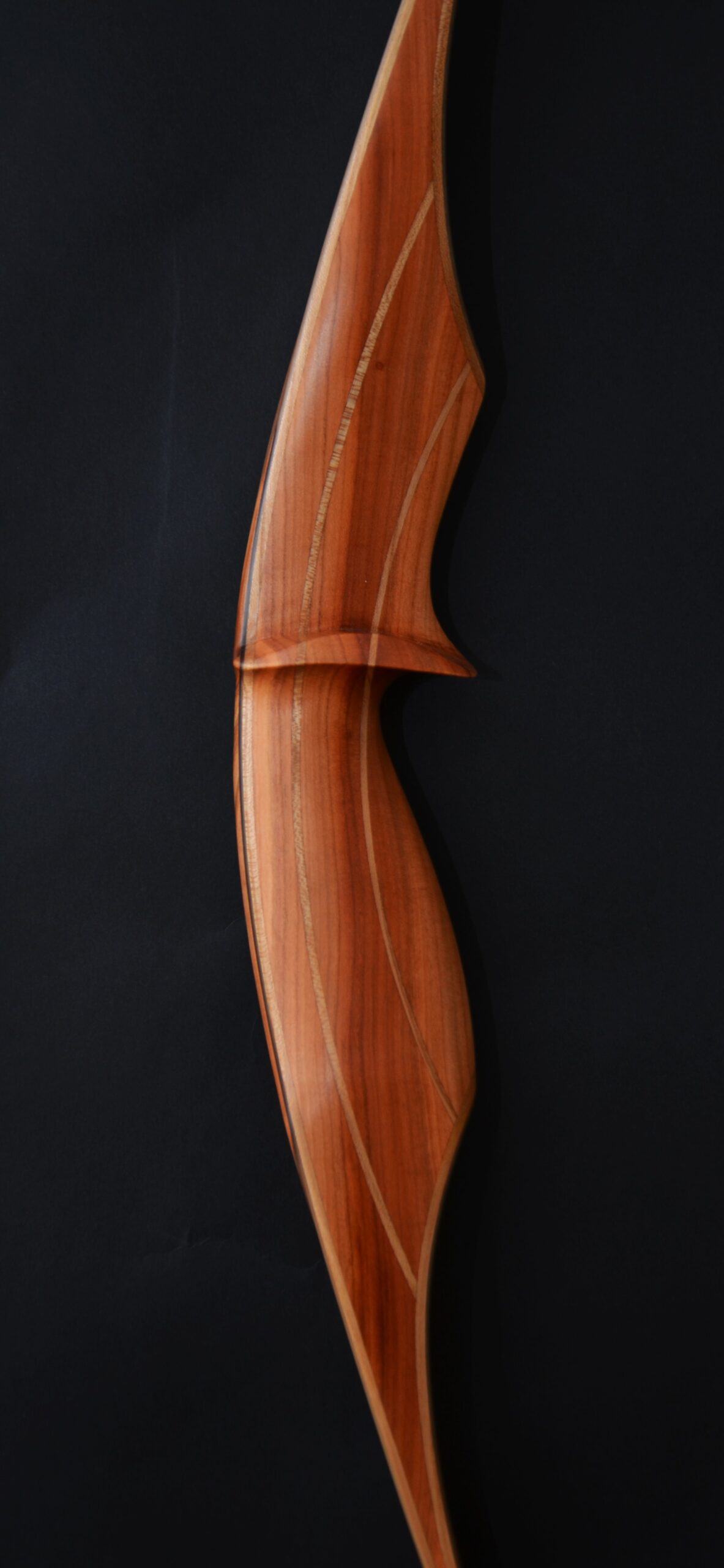 Der eher helle Rüster-Deckfurnier -eher ins gräuliche braun gehende- setzt farblich einen Kontrast zu dem warmen rotbraunen Zwetschgenholz. Der leichte natürliche sunburst Farbverlauf zu den Wurfarmenden hin zeigt den Rüster in seinem tollen Facettenreichtum. Diese Kombination verleiht diesem Bogen seinen einzigartigen Charakter.